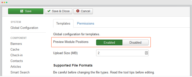 在设置面板中,请启用选项预览模块的位置。这个选项将帮助您预览当前模板的可用位置,然后保存设置。